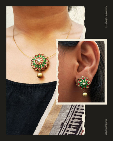 This beautifully detailed floral terracotta neckset showcases rich green and red tones with a traditional touch. The invisible thread enhances the pendant’s prominence, giving a neat and modern finish. Ideal for ethnic outfits, poojas, and small functions.