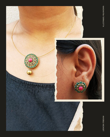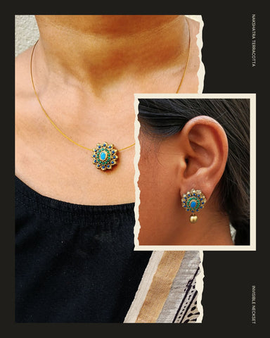 A classic round terracotta pendant highlighted with blue accents and matching earrings. The invisible chain design keeps the look minimal while the detailed pattern adds charm. Suitable for both everyday ethnic styling and special occasions.