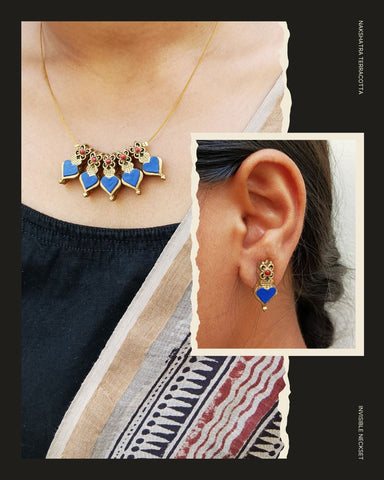 Charming handcrafted terracotta invisible neckset featuring blue heart details. Lightweight, unique and perfect for casual and festive looks.