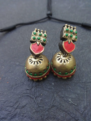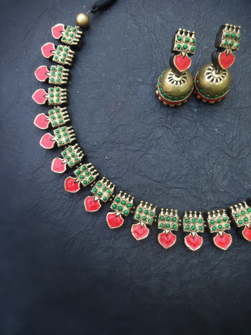With this exquisitely created terracotta jewelry set, you may add classic beauty to your ethnic collection. This item embodies traditional South Indian creativity, with traditional mango (paisley) designs emphasized in vivid green and red hues.